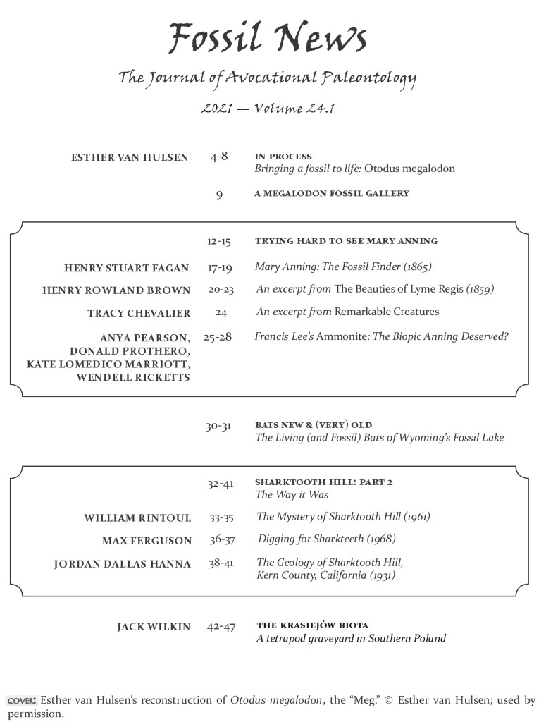 The cover of the Spring 2021 issue features the paleoart of Esther van Hulsen. In the accompanying “in process” article, van Hulsen describes bringing Otodus megalodon to life. A 16-page special section, “Trying Hard to See Mary Anning,” includes commentary on the semi-biographical 2020 film, Ammonite; excerpts from Tracy Chevalier’s novel Remarkable Creatures; and an 1859 sketch by Henry Rowland Brown, whose travel memoir, The Beauties of Lyme Regis, included one of the first biographies of Anning. We also take a trip back to the Sharktooth Hill of the 1960s, then a widely publicized tourist destination for Southern California travelers.